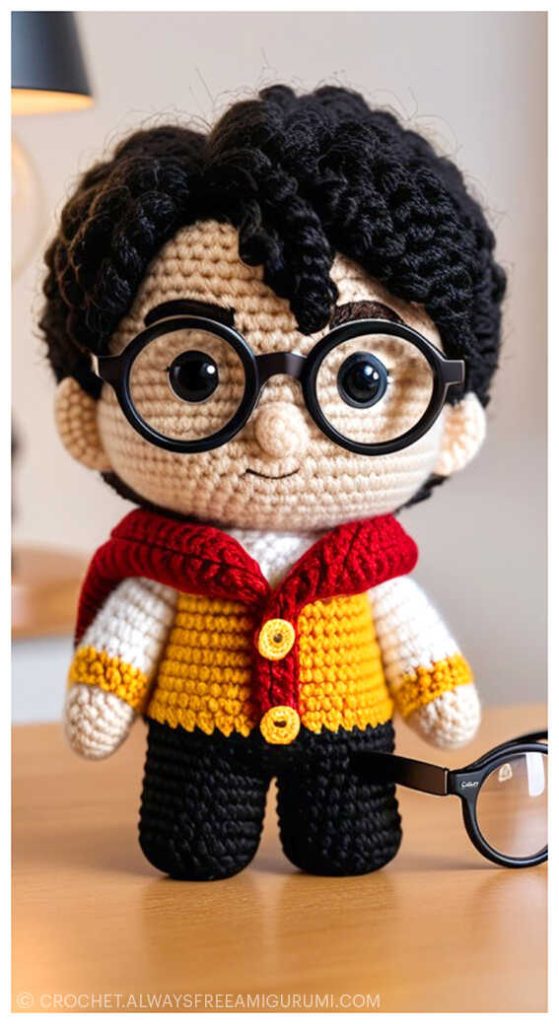 Bring a touch of magic to your crochet world with this adorable Amigurumi Harry Potter Crochet Free Pattern designed by Celeste Bitiol. Inspired by the beloved young wizard who captured the hearts of millions around the globe, this pattern lets you recreate Harry’s iconic look with charming handmade details. Using simple stitches and a step-by-step, beginner-friendly structure, even new crocheters can craft a delightful mini wizard that’s perfect for gifting, collecting, or displaying on your bookshelf. You’ll find all essential materials woven naturally into the project—2mm needle, 3.5cm glasses, 8mm safety eyes, black, yellow, red, light gray, dark gray, and pink yarn, fine black and red lines, and of course filling, glue, and a carpet needle to bring the character to life.