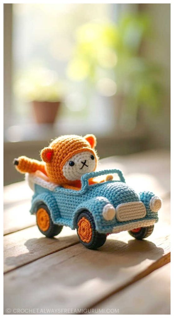 To create this cute amigurumi car, you’ll need brown, white, black, gray, and yellow fingering acrylic yarn (100g–438m), a US size 10 steel crochet hook (1.3mm), and polyester toy stuffing for shape and softness. Nadezhda Kosmakova’s delightful design captures the fun and creativity of amigurumi while keeping it simple and accessible. Don’t forget to explore the end of the pattern for more wonderful amigurumi car ideas to keep your inspiration rolling!