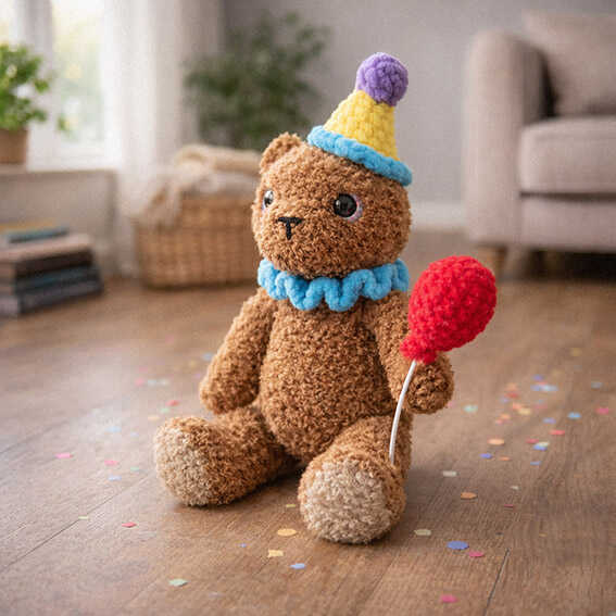This pattern uses basic stitches but includes multiple elements like accessories and shaping, making it more suitable for intermediate crocheters rather than beginners. The design is worked with soft yarns and simple techniques, yet the added details like the balloon and party hat bring extra character. If you enjoy cute toy designs, you might also like this tiny bunny shared on one of our blogs.