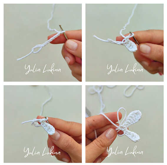 ch 10, from the 4th ch from the hook work 3 tr, 2 dc, 2 sc (large wing),
